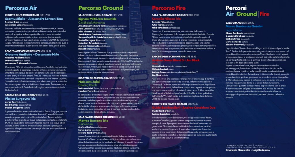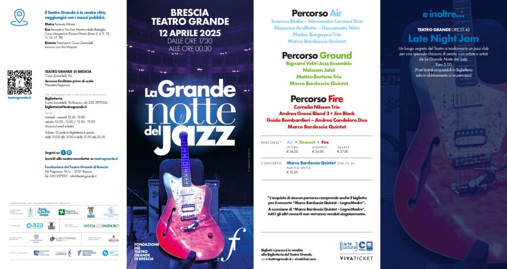 Brescia – L’edizione 2025 della maratona jazz del Teatro Grande riconferma la formula già collaudata dei tre percorsi musicali – Air, Ground e Fire – che si alterneranno a partire dalle 17.30 negli spazi del Teatro Grande: Ridotto, Sala Palcoscenico Borsoni e Salone delle Scenografie saranno i luoghi più intimi del Teatro che trasporteranno il pubblico in un vero e proprio viaggio musicale.