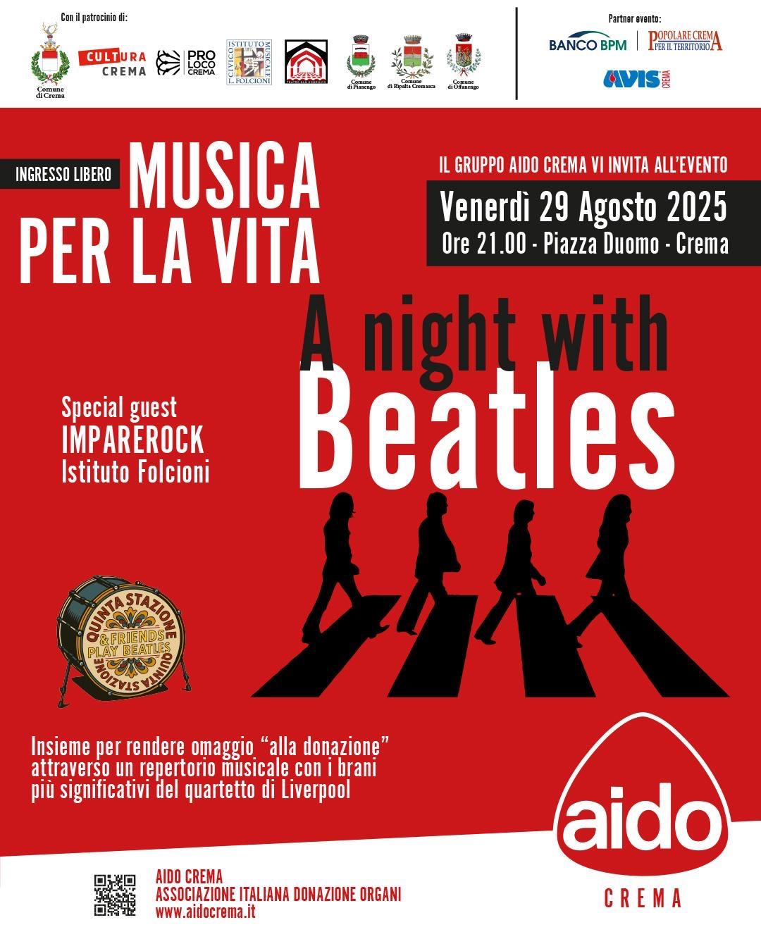 Paolo Cella, che è anche Direttore Artistico dei “Beatles Days Crema”, spiega che da 12 anni il suo gruppo si impegna a realizzare iniziative che coniughino eventi di beneficenza all’aspetto divulgativo della musica del quartetto di Liverpool e dichiara la propria soddisfazione per il prossimo evento: “Siamo felici di collaborare con una realtà così importante come il gruppo Aido Crema, lo faremo alternando la nostra Band al Laboratorio Imparerock dell’Istituto Folcioni e ospitando importanti musicisti cremaschi nonché
