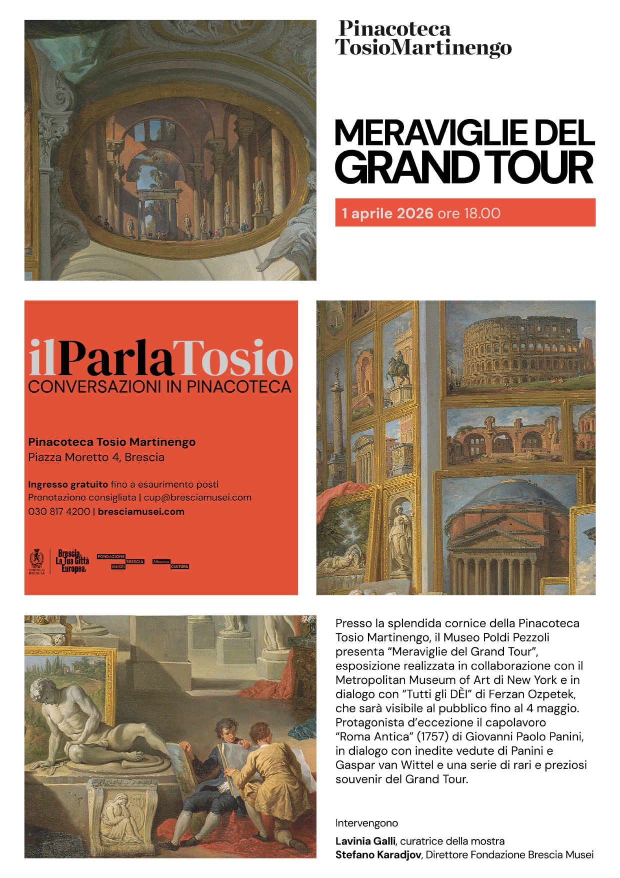 Brescia – Nuovo appuntamento alla Pinacoteca Tosio Martinengo per il format culturale ilParlatosio. L’incontro sarà dedicato all’esposizione “Meraviglie del Grand Tour” del Museo Poldi Pezzoli – tra i fondatori insieme a Fondazione Brescia Musei della rete dei musei dedicati all’800 lombardo, realizzata in collaborazione con il Metropolitan Museum of Art di New York e in dialogo con l’opera video “Tutti gli DÈI” di Ferzan Ozpetek, attualmente aperta al pubblico e visitabile fino al 4 maggio.