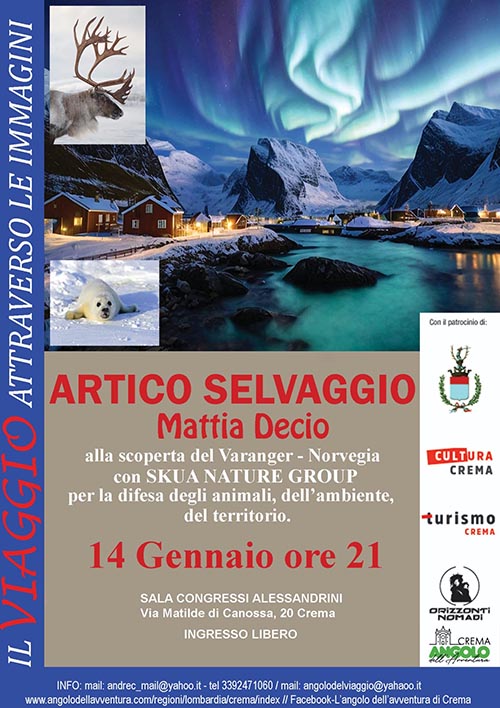 Crema, Cremona. Un nuovo anno alla scoperta degli angoli più affascinanti e selvaggi del Mondo, a cura dell’Associazione culturale Orizzonti Nomadi, avventure narrate dalla voce di chi le ha vissute. L’overture delle serate martedì 14 gennaio alle ore 21, presso la sala Alessandrini di Crema, è affidata alle immagini e racconto del viaggiatore Mattia Decio dal titolo “Artico selvaggio, alla scoperta del Varanger – Norvegia”, con Skua Nature Group per la difesa degli animali, dell’ambiente, del territorio.