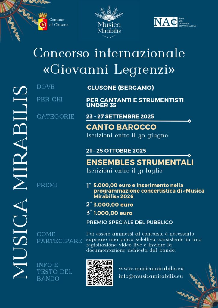 Clusone, Bergamo – Nell’ambito della quarta edizione del festival musicale internazionale «Musica Mirabilis», Clusone diventa la sede privilegiata del Primo concorso internazionale «Giovanni Legrenzi», riservato a cantanti e ad ensembles strumentali composti da musicisti under 35 (nati non prima del 1990), provenienti da tutta Europa.