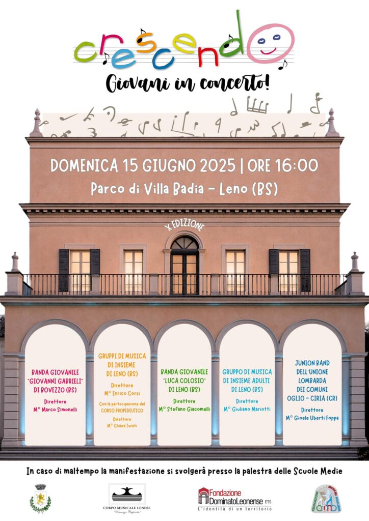 Leno, Brescia – Con grande emozione ritorna nel Parco di Villa Badia, la rassegna musicale dedicata al mondo della bande giovanili : “CRESCENDO…GIOVANI IN CONCERTO”.