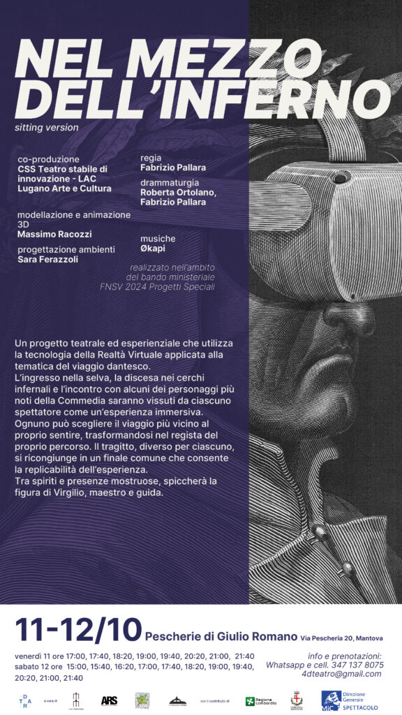 Nel mezzo dell’Inferno. Viaggiare dentro la Divina Commedia, con la guida speciale del maestro Virgilio, si può grazie a questo lavoro teatrale ed esperienziale – con la regia di Fabrizio Pallara che cura anche la drammaturgia in collaborazione con Roberta Ortolano – che utilizza la tecnologia della Realtà Virtuale Immersiva coniugata a una progettazione architettonica dello spazio e del suono in 3D, con l’intento di porre il pubblico a contatto con una dimensione fantastica, che non vuole sostituirsi a quella reale, ma restare a questa interconnessa, rappresentando uno stimolo di ricerca e cambiamento.