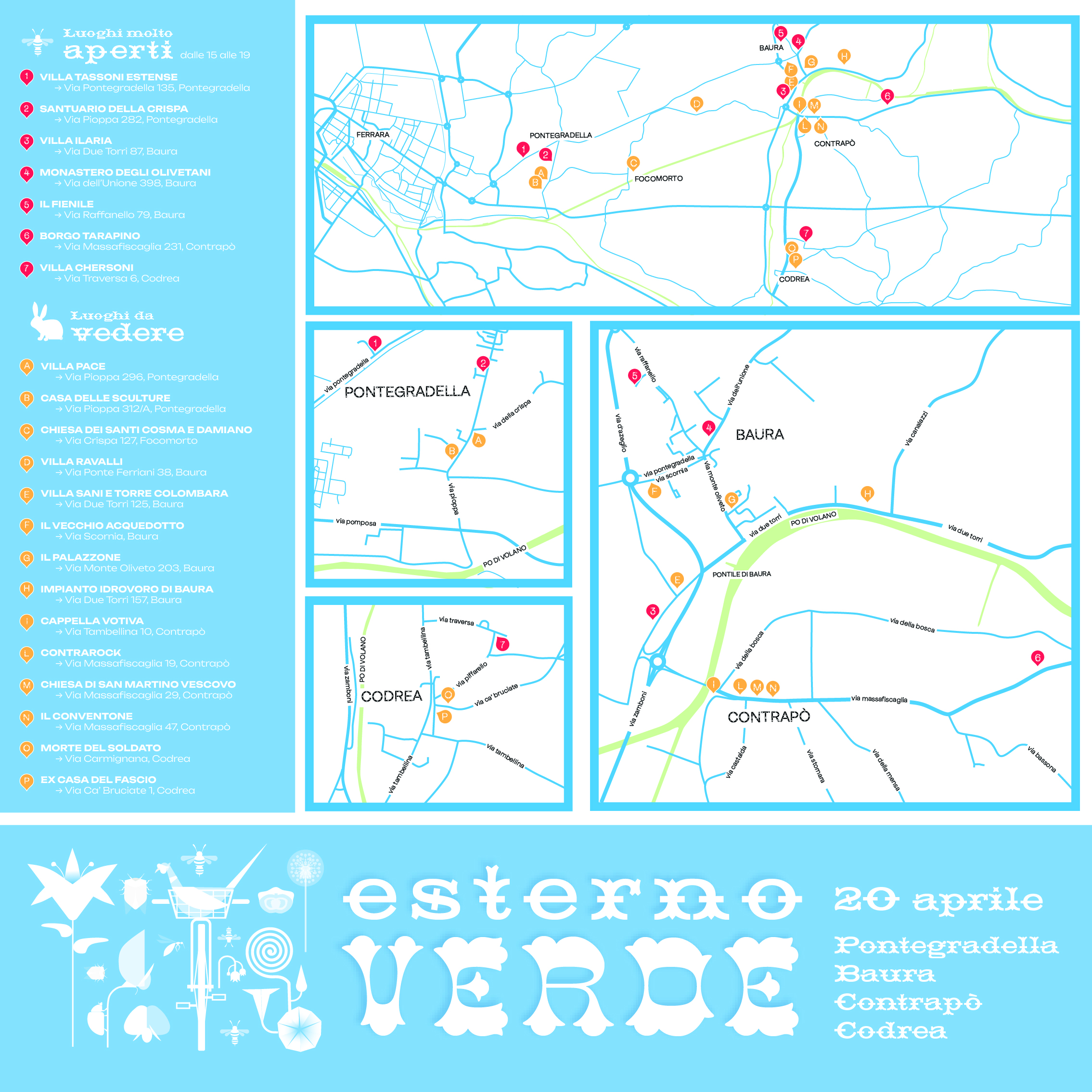 Nel pomeriggio via libera all’esplorazione. Tra Pontegradella, Baura, Contrapo e Codrea saranno eccezionalmente aperti al pubblico, dalle 15 alle 19, tanti spazi curiosi, capaci di raccontare il passato e il presente del territorio. Da non perdere: Villa Tassoni Estense, il Santuario della Crispa, Villa Ilaria, il Monastero degli Olivetani, il Fienile, Borgo Tarapino e Villa Chersoni. La mappa di Esterno Verde, già disponibile online, sarà distribuita in formato cartaceo in ciascuno di questi luoghi, oltre che all’infopoint, allestito in piazza a Baura.