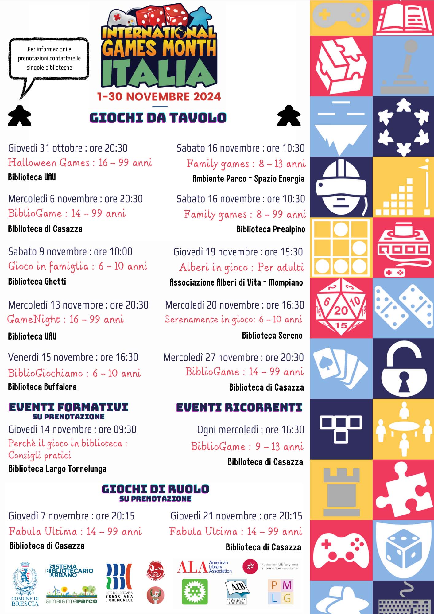 Sette biblioteche del Sistema Bibliotecario Urbano (Buffalora, Casazza, Ghetti, Prealpino, Sereno, Torrelunga e UAU) hanno aderito alla proposta pianificando, per tutto il mese di novembre, un intenso calendario di incontri dedicati ai giochi da tavolo, al gioco di ruolo, agli scacchi e a incontri formativi pensati per un target molto ampio: famiglie, bambini e ragazzi, giovani e adulti di ogni età.