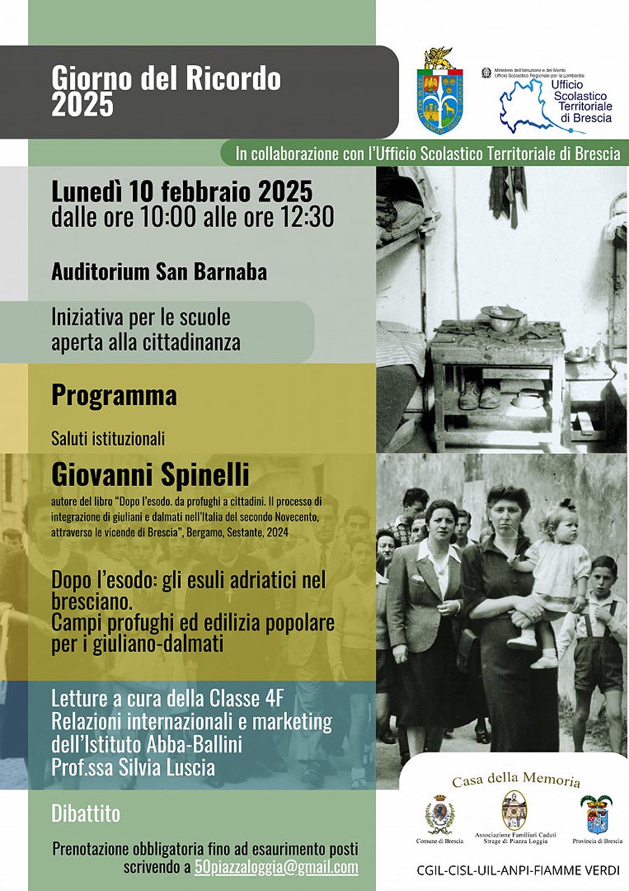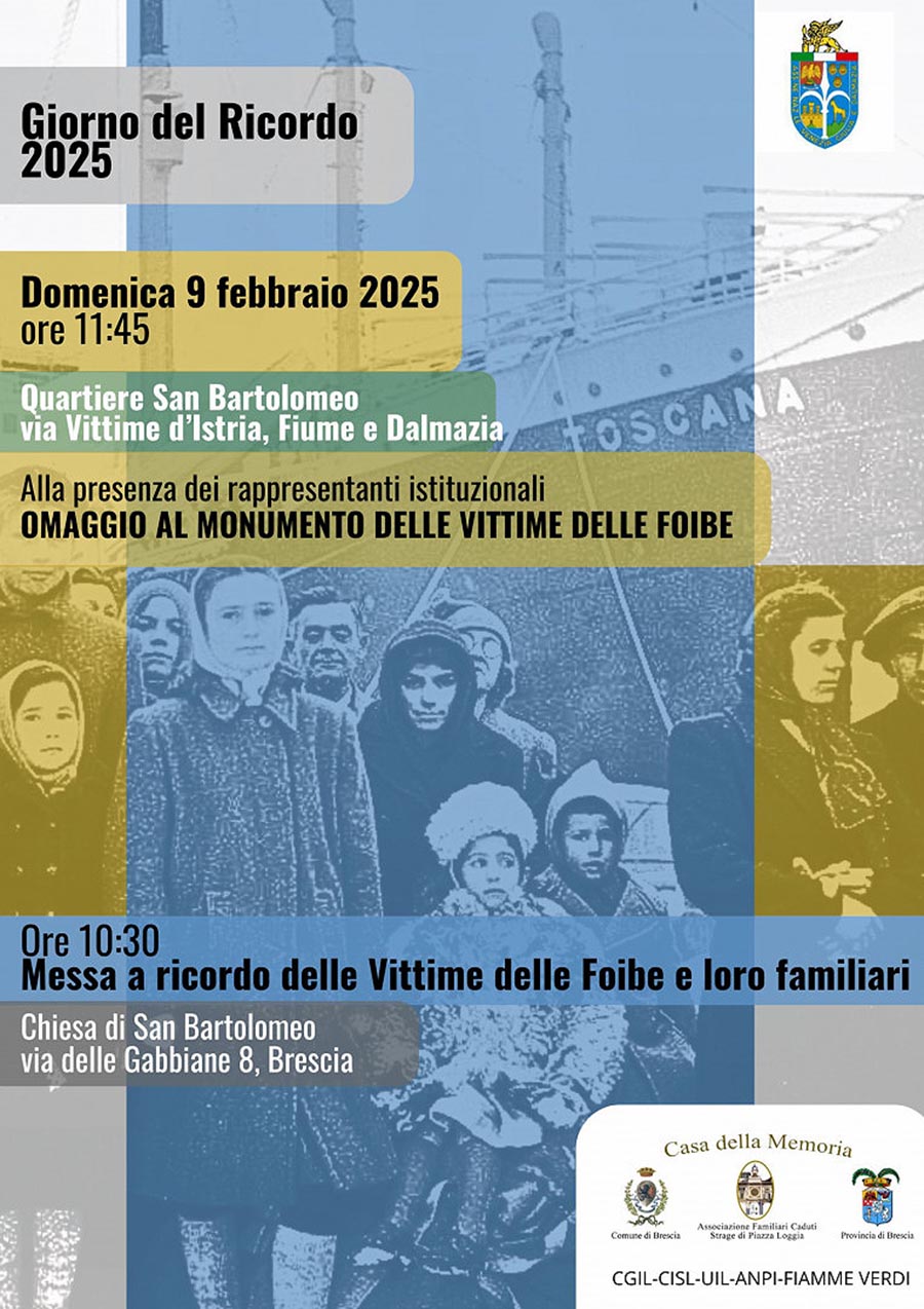 Brescia. L’associazione Casa della Memoria per il “Giorno del Ricordo“, che si celebra il 10 febbraio di ogni anno in memoria delle Vittime delle foibe, dell’Esodo Istriano, Fiumano, Giuliano e Dalmata e delle vicende del confine orientale, organizza due giornate domenica 9 e lunedì 10 febbraio.