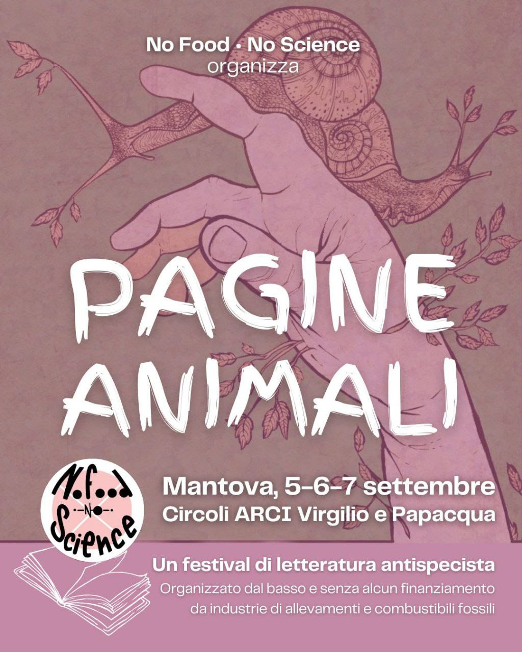 Al contro-festival Pagine Animali scrittori, poeti, drammaturghi, filosofi, artisti e attivisti discuteranno di come la letteratura possa diventare uno strumento in difesa degli altri animali e delle condizioni necessarie per sopravvivere su questo pianeta (qui il programma completo, anche in formato testo). Tre giorni di incontri durante i quali i circoli Arci Virgilio e Papacqua offriranno spazi conferenze accessibili e gratuiti e pasti sostanziosi a base vegetale.