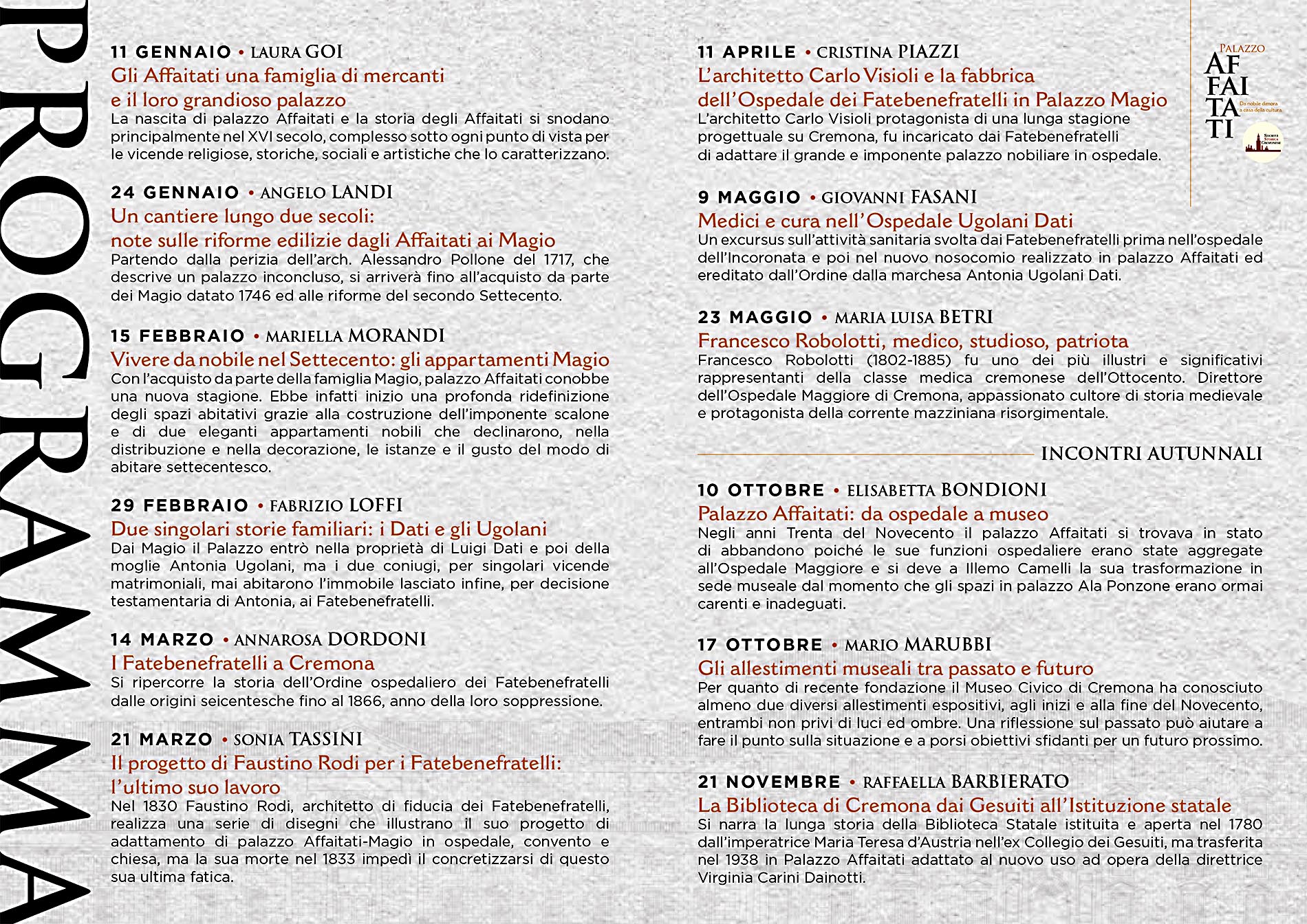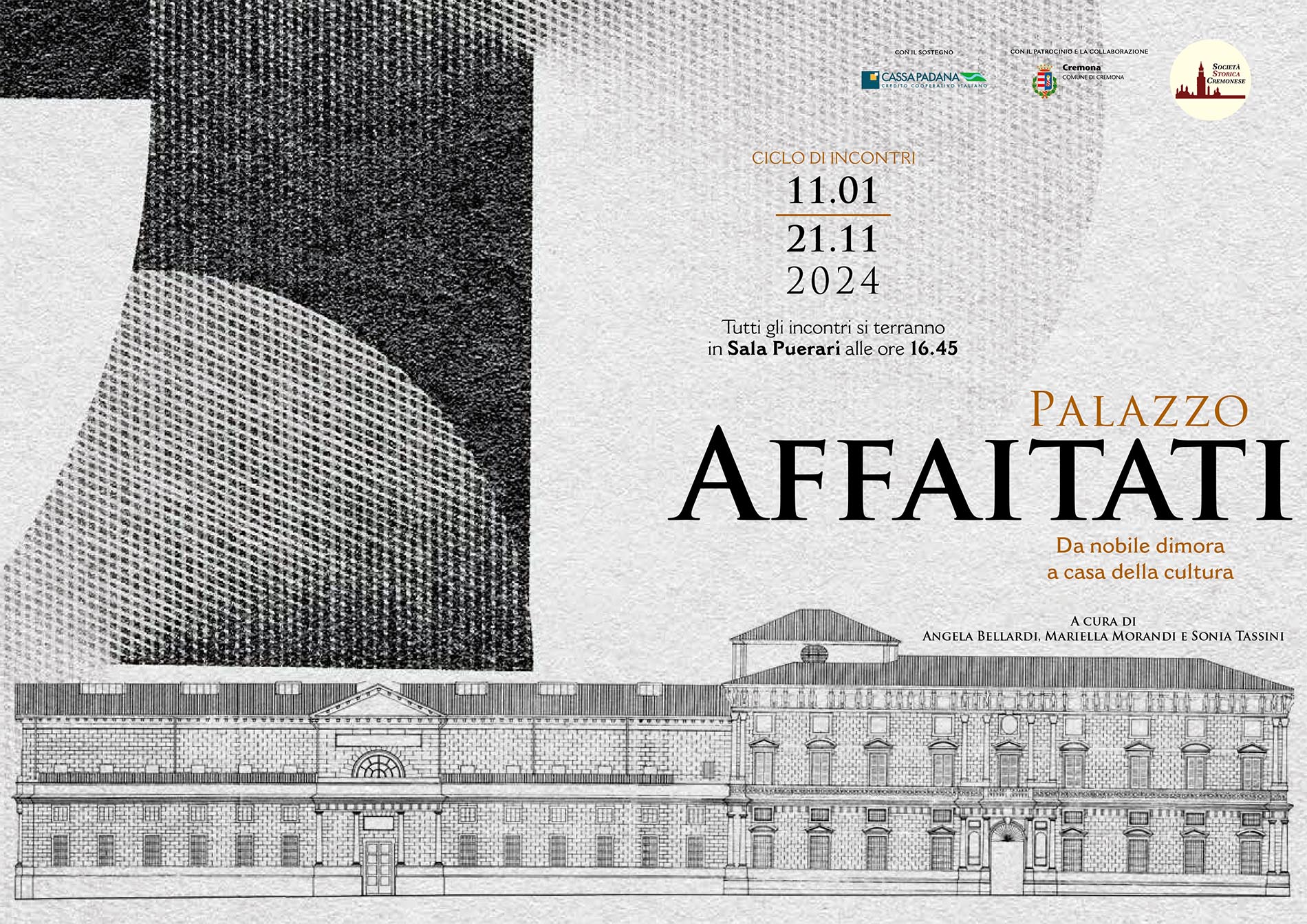 Un importante programma di conferenze dal titolo: “Palazzo Affaitati, da nobile dimora a casa della Cultura“, organizzate dalla Società Storica Cremonese con il sostegno di Cassa Padana BCC, affronta la storia della dinastia Affaitati, famiglia di mercanti e del loro prestigioso palazzo. Nei secoli ha visto il passaggio da nobile dimora a ospedale e infine a casa della Cultura con i suoi preziosi musei che raccontano la storia della città dal medioevo al ‘900 e la Biblioteca Statale. Le conferenze sono a cura di Angela Bellardi, Mariella Morandi e Sonia Tassini della Società Storica Cremonese, tutti gli incontri si terranno in Sala Puerari alle ore 16,45.