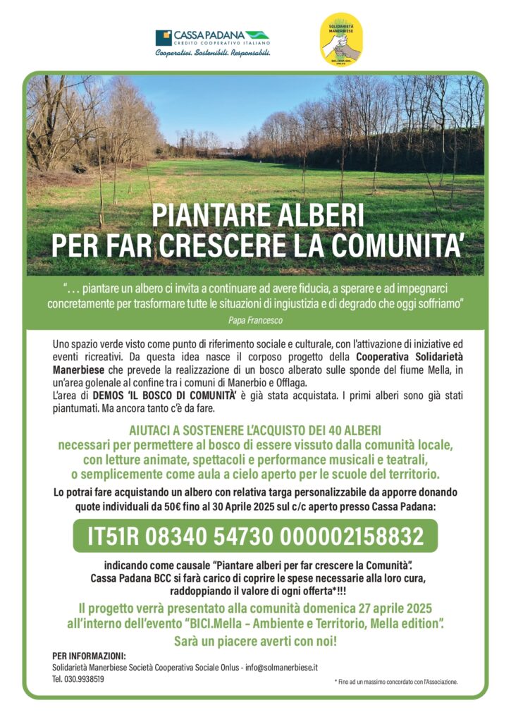 Uno spazio verde visto come punto di riferimento sociale e culturale, con l’attivazione di iniziative ed eventi ricreativi. Da questa idea nasce il corposo progetto della cooperativa che prevede la realizzazione di un bosco alberato sulle sponde del fiume Mella, in un’area golenale al confine tra i comuni di Manerbio e Offlaga.