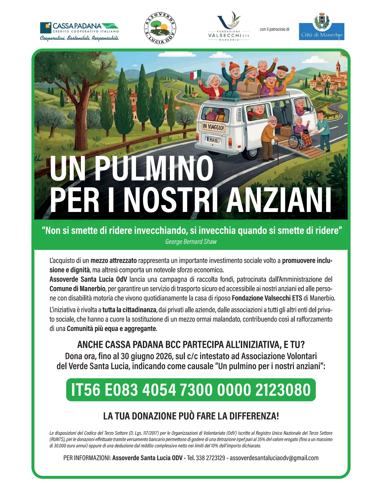 L’acquisto del mezzo comporta un importante impegno economico. Per questo motivo Assoverde Santa Lucia ODV ha deciso di lanciare una campagna di raccolta fondi, patrocinata dal Comune di Manerbio e con il sostegno di Cassa Padana Bcc, per garantire un servizio di trasporto sicuro ed accessibile ai nostri anziani ed alle persone con disabilità motoria che vivono quotidianamente la casa di riposo.