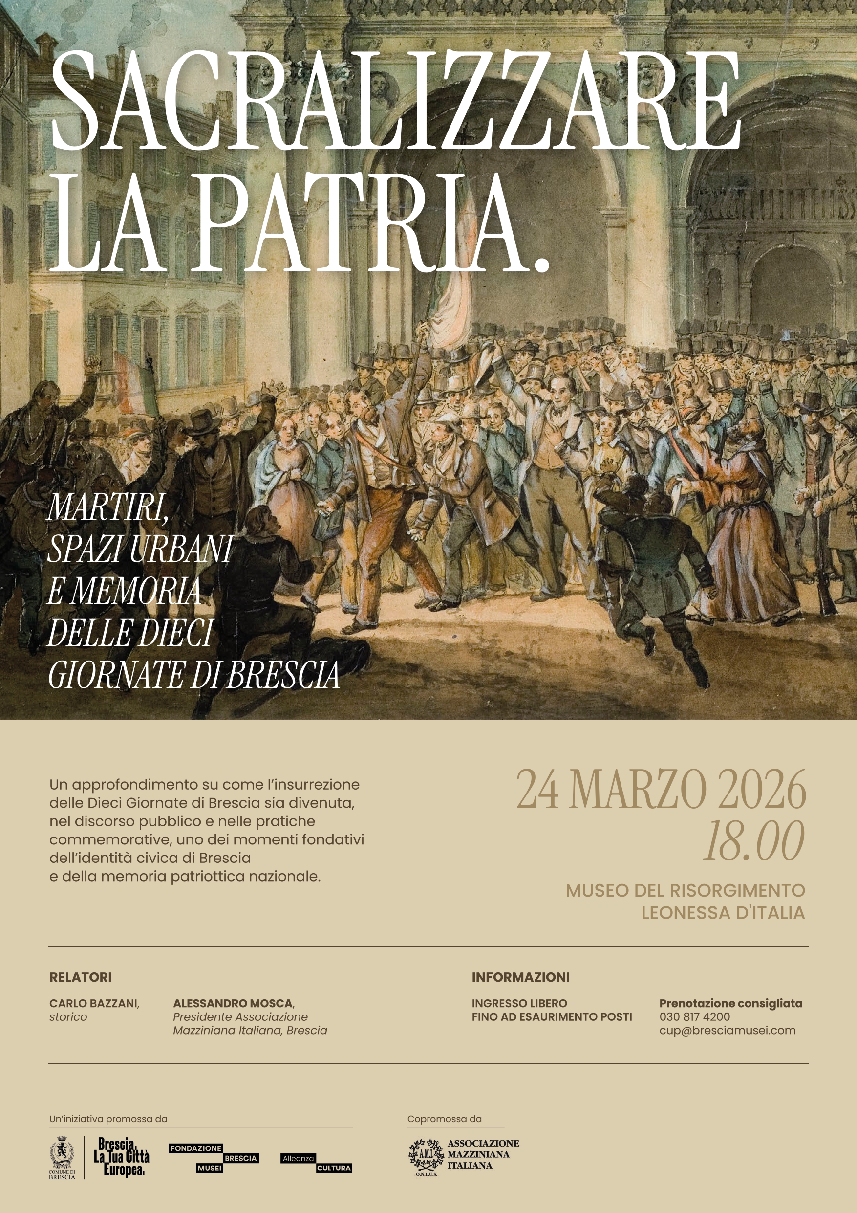 Brescia  – Il rapporto tra storia, memoria e identità civica sarà al centro delle riflessioni del talk Sacralizzare la patria. Martiri, spazi urbani e memoria delle dieci giornate di Brescia. In occasione dell’anniversario dell’insurrezione delle Dieci giornate di Brescia (23 marzo – 1° aprile del 1849), la conferenza propone una lettura dell’avvenimento non solo come un momento decisivo nella costruzione dell’identità della città, ma anche come un episodio cruciale della storia risorgimentale nazionale.