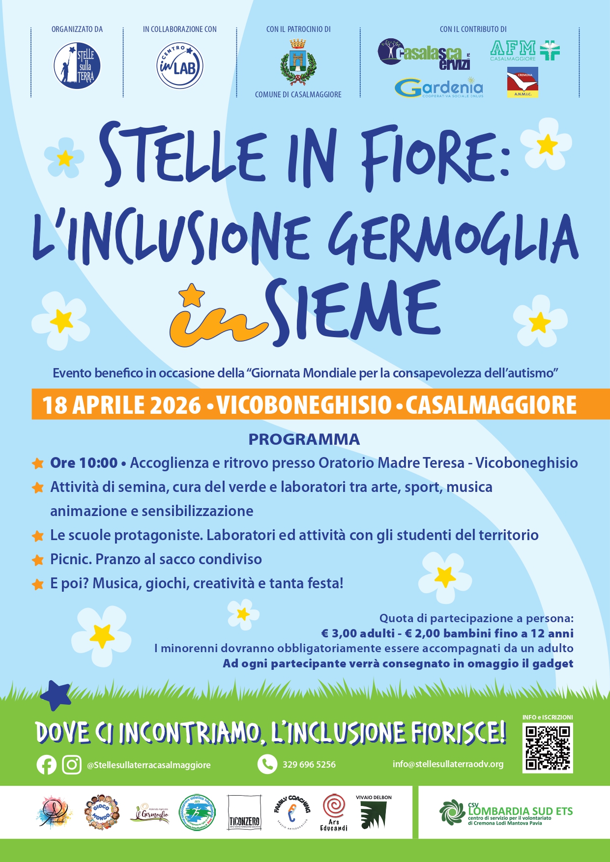 Casalmaggiore, Cremona – Appuntamento con “Stelle in fiore: l’inclusione germoglia INsieme”, iniziativa promossa da Stelle sulla Terra O.d.V. in partnership con Centro inLAB A.P.S., con il patrocinio del Comune di Casalmaggiore, il supporto di A.N.M.I.C. Cremona, Gardenia coop. sociale, Casalasca Servizi S.p.A., AFM Casalmaggiore e la collaborazione di CSV Lombardia Sud ETS.