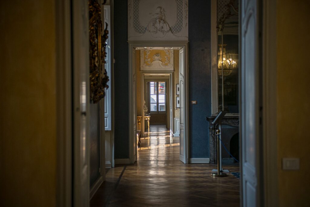 Ogni sala è finemente decorata con gli stucchi originali settecenteschi, dove trionfano putti, elementi di ornato e un ricco foliage memore della tradizione del decorativismo francese. Inoltre, il Palazzo ha instaurato un dialogo con l’arte contemporanea che in alcuni spazi entra in contatto con elementi della collezione permanente”.