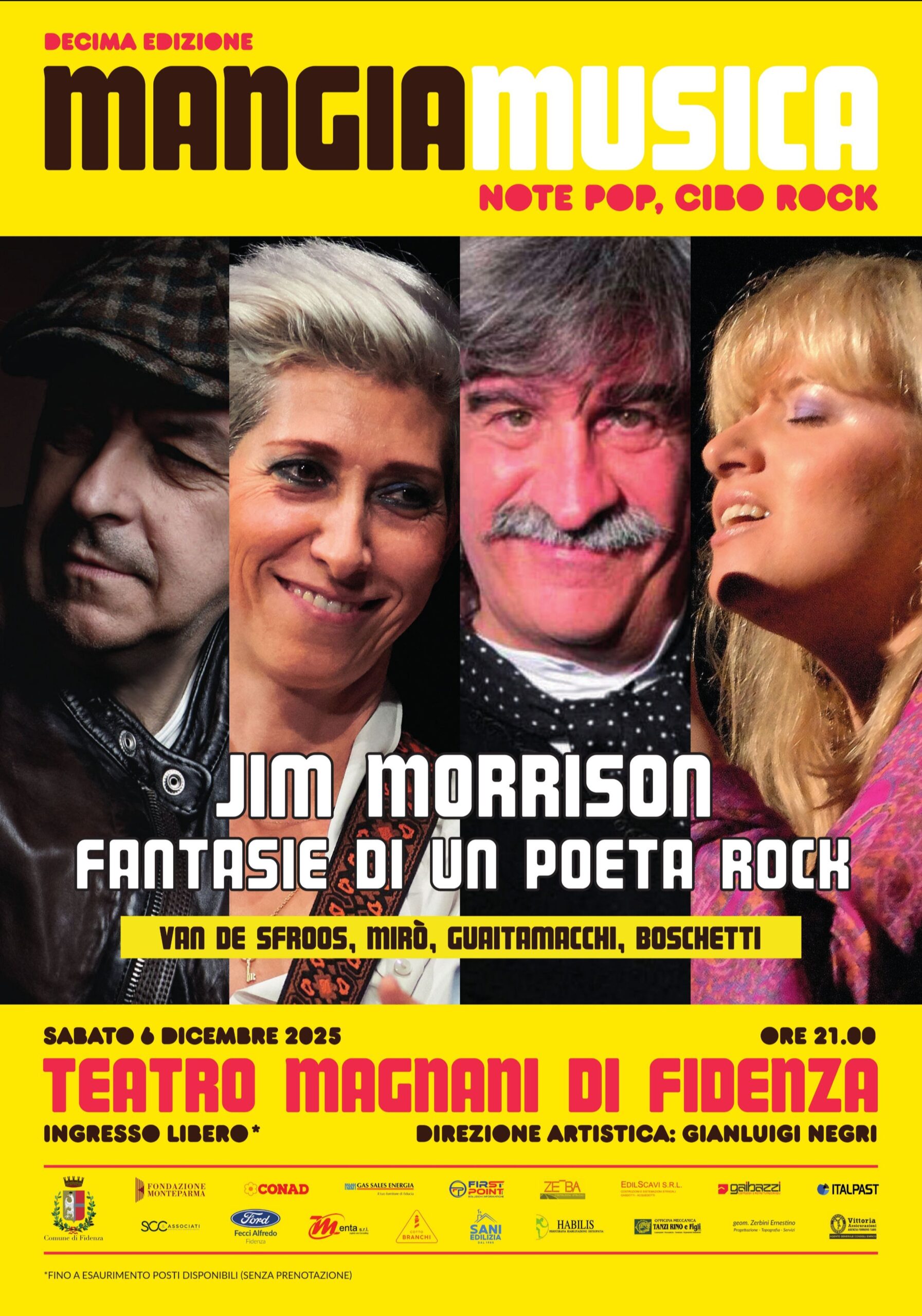 Si tratta di Davide Van De Sfroos, Andrea Mirò, Ezio Guaitamacchi e Brunella Boschetti, i quali sabato 6 dicembre porteranno in scena (inizio alle 21, ingresso gratuito) lo spettacolo “Jim Morrison – Fantasie di un poeta rock”, nel sessantesimo anniversario della nascita dei Doors.